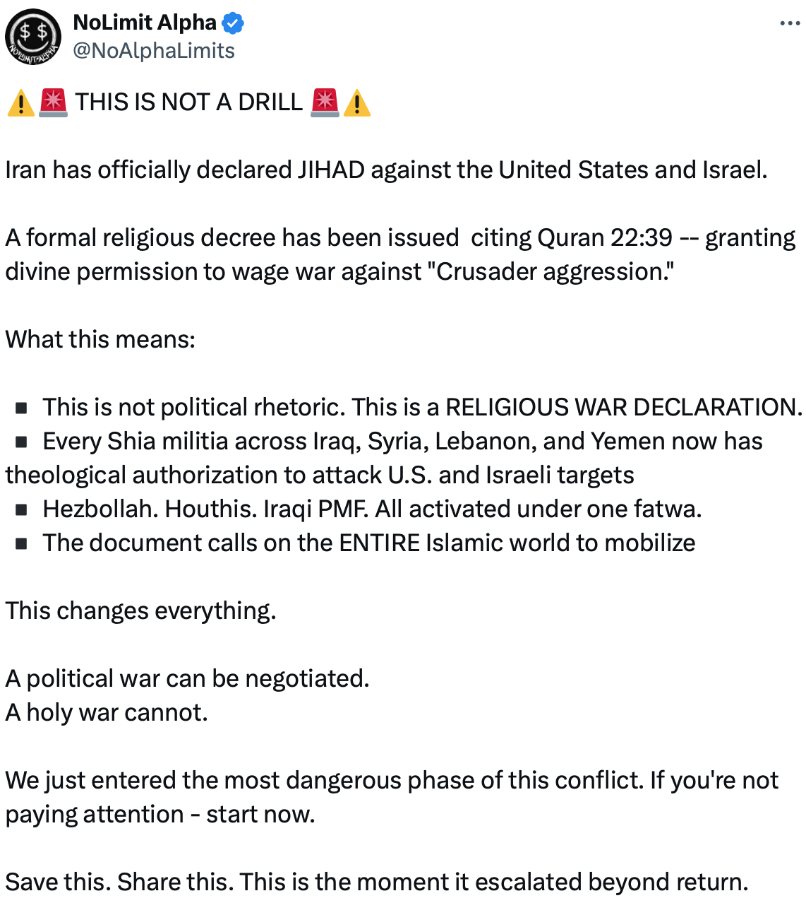 I think that an X user known as “NoLimit Alpha” has done a good job of summarizing what we are now facing…