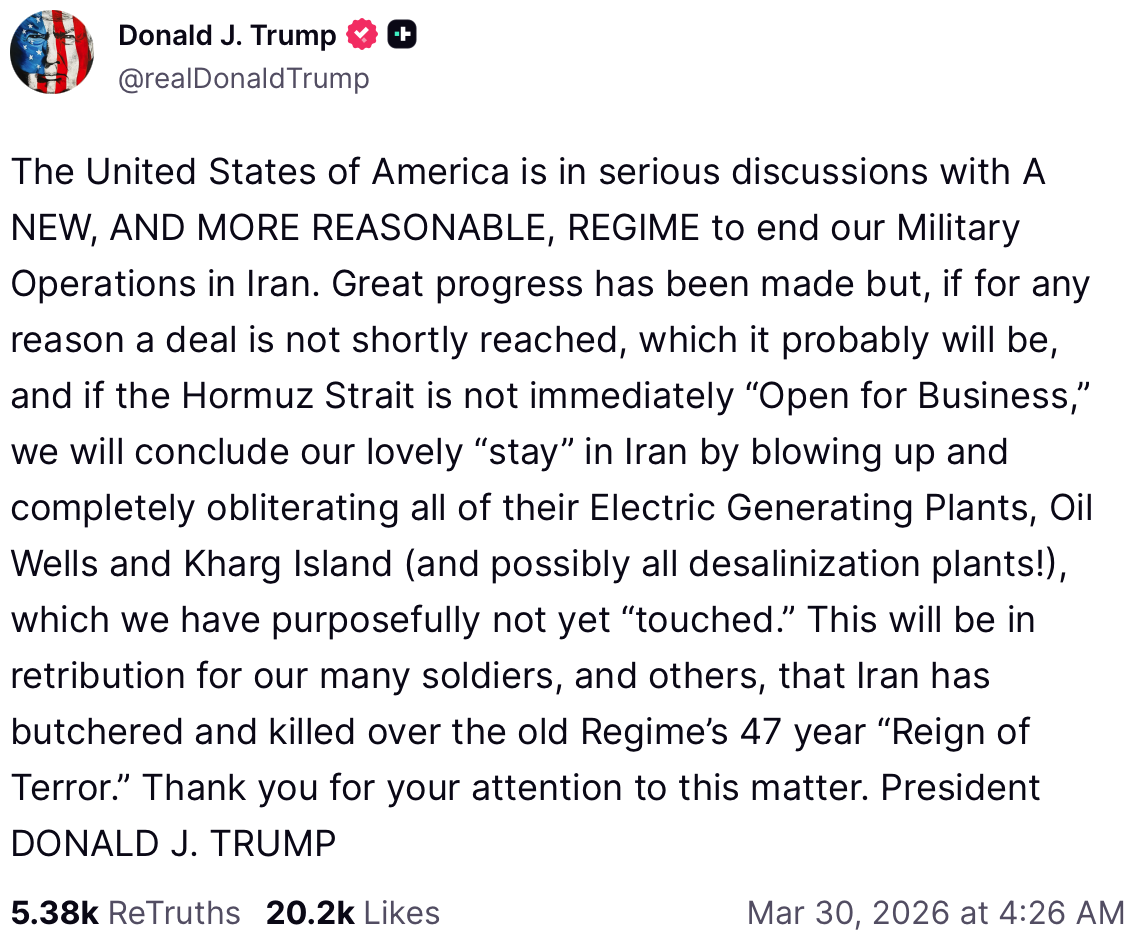 In a lengthy post on Truth Social, he warned that if Iran does not quickly agree to the deal that he is offering, the U.S. will obliterate the Iranian power grid, destroy Iran’s oil producing facilities, attack Kharg Island, and potentially go after their desalination plants…