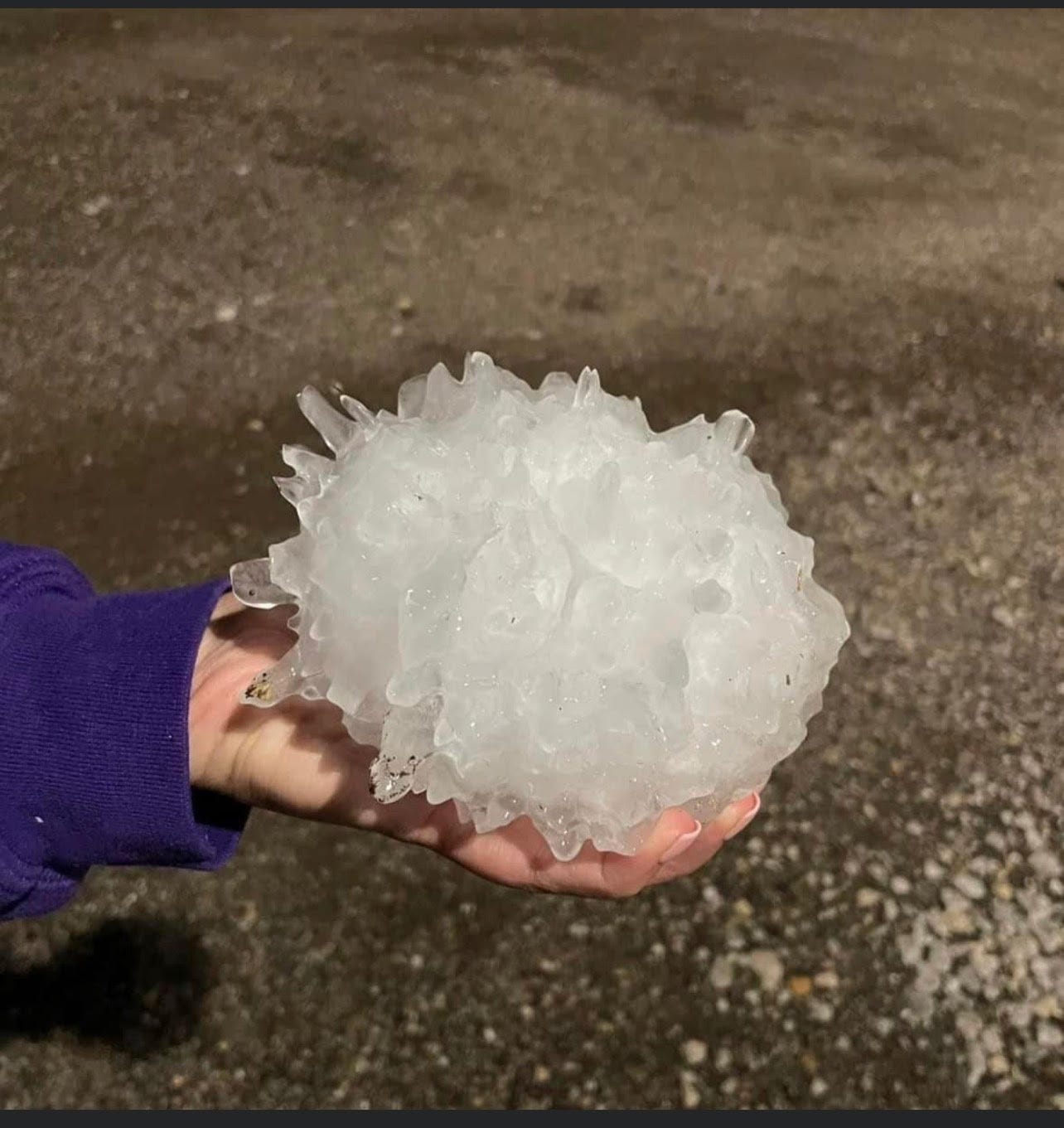 Spearman told Storyful that she was in her living room when the hail started. “It sounded like bombs going off, and we looked outside and saw huge softball-sized hail,” she said.