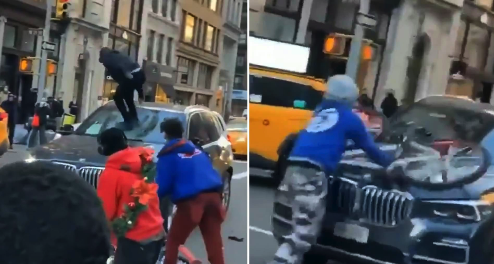 Shocking video shows several teens punching the BMW’s windows and stomping on its hood.