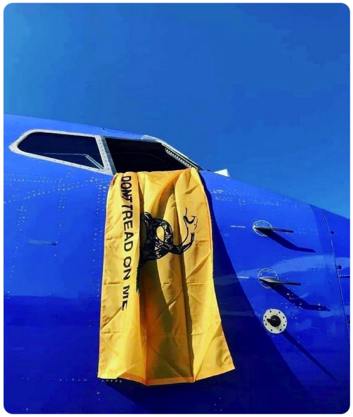 This photo was just sent to me of a grounded Southwest plane flying a Gadsden flag out of the cockpit. The Hero Pilots at Southwest and other Airlines deserve our support. True patriots worthy of the American Freedom Fighter tradition.