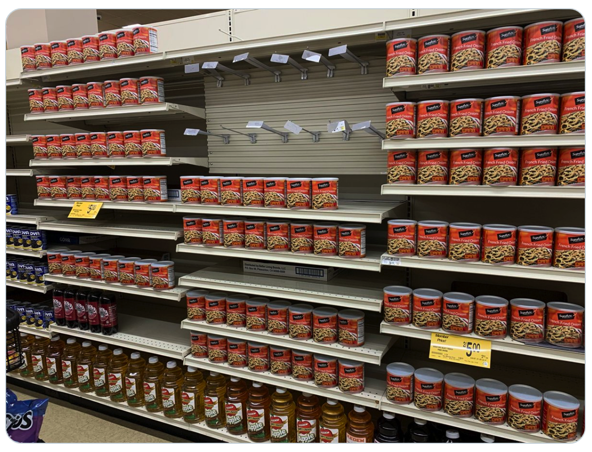 Our Safeway appears to be trying to hide the supply shortage by using single lines of products to fill shelves. Leading to this: pic.twitter.com/CDXR67FYRu