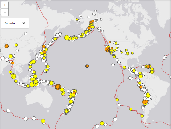 And of course the San Andreas fault is only a small section of a seismic zone known as the Ring of Fire that roughly encircles the entire Pacific Ocean. The U.S. Geological Survey provides tools that show the latest earthquakes in the world, and earlier today I used one of those tools to display all of the earthquakes along the Ring of Fire of magnitude 2.5 or greater that have happened within the last 30 days. The following is a screenshot of what I discovered…