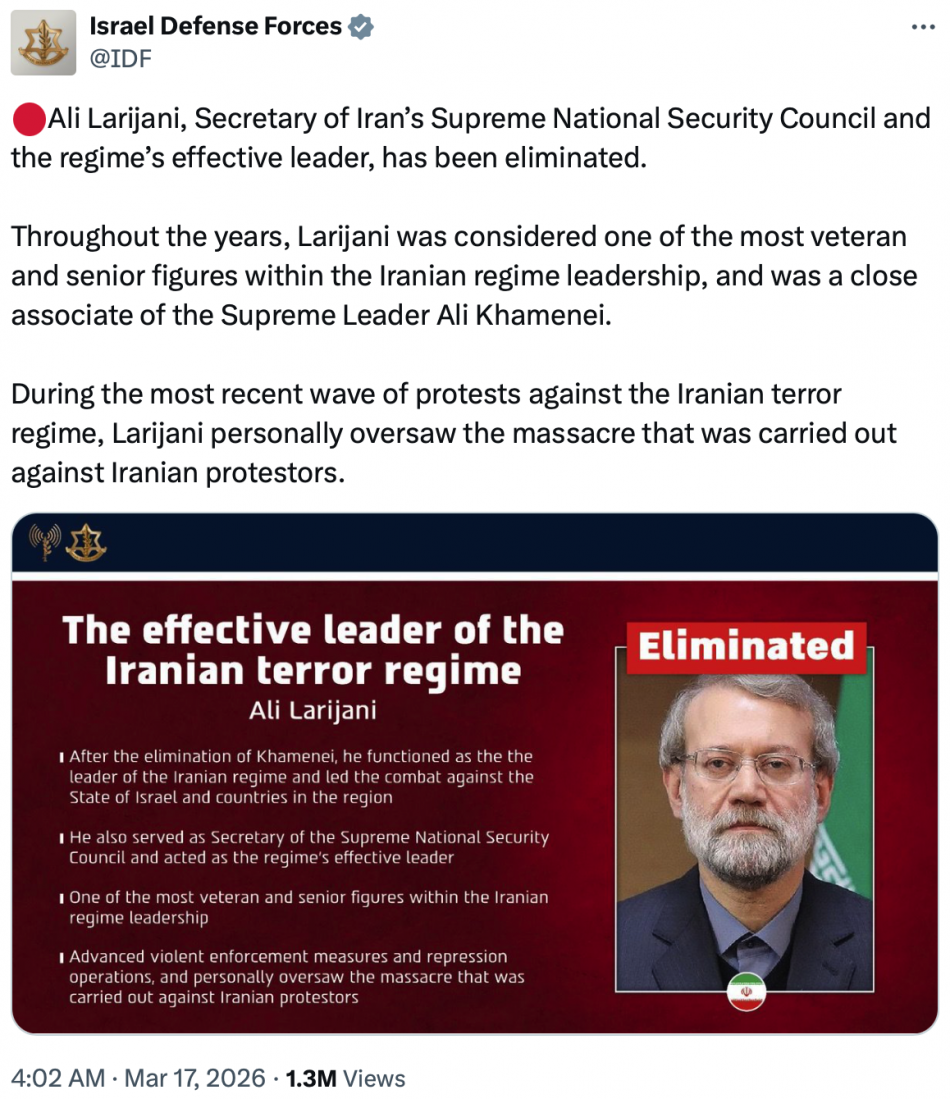“For years, Larijani was considered one of the most senior and veteran figures in the leadership of the Iranian terror regime,” the IDF said, noting his close relationship with Khamenei.