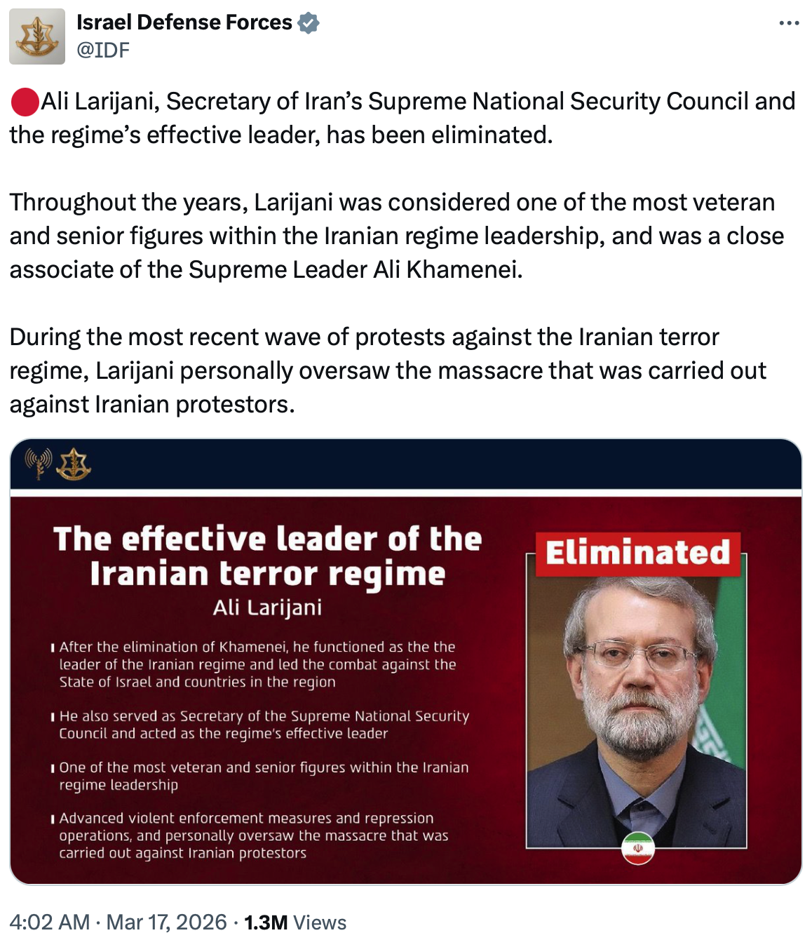 When they announced his death, the IDF correctly noted that Larijani was “the de facto leader of the Iranian terror regime”…