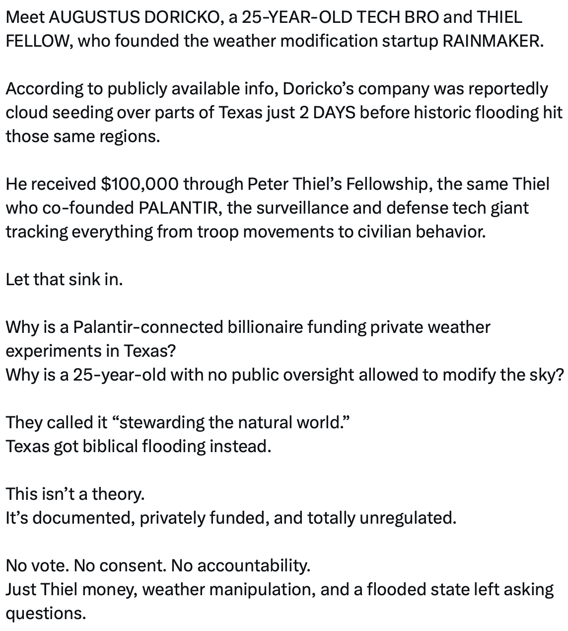 Rainmaker Technology CEO Augustus Doricko is claiming that his company had nothing to do with the recent flooding because his company did not do any cloud seeding in Texas on July 3rd or July 4th. But he is admitting that his company was doing cloud seeding in Texas on July 2nd…